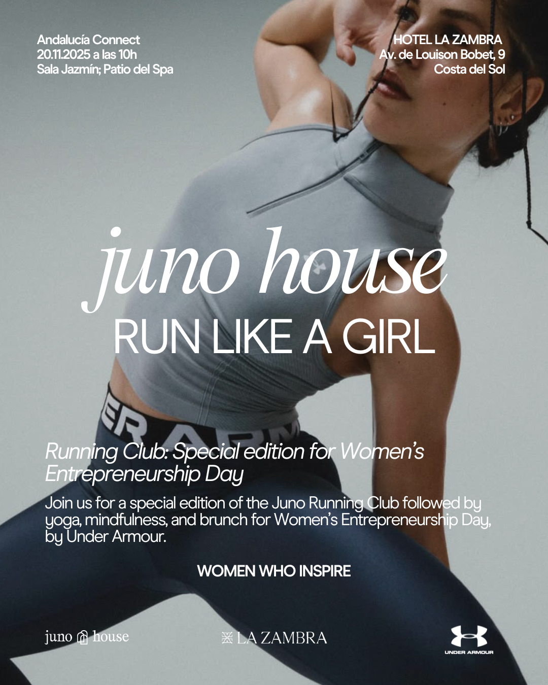 Join us for a special edition of our iconic Running Club, powered by Under Armour, this time hosted at La Zambra. Limited to just 20 guests, the experience includes a running session, followed by pilates and mindfulness, and a healthy brunch led by Juno Woman and fitness ambassador, Carolina Guillén, together with Lisa Dang from Rachel’s Eco Love and Juno House Co-Founder, Liana Grieg.