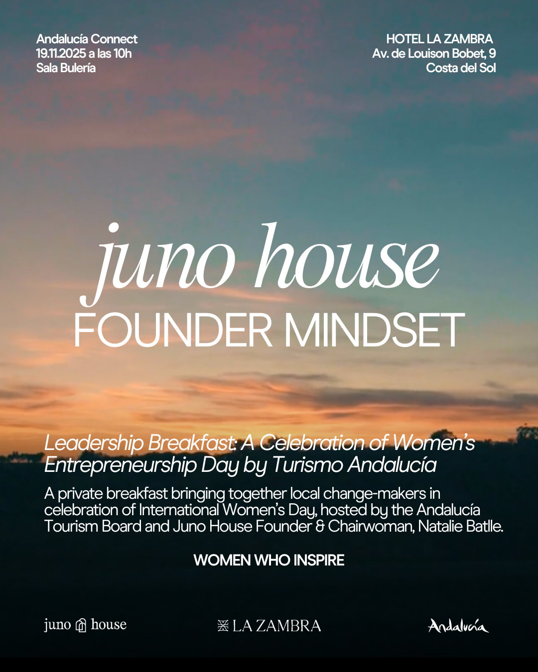 Celebrate Women’s Entrepreneurship Day with Juno House and the Andalucía Tourism Board. A roundtable about resilience, intuition, and the art of starting a business, featuring women entrepreneurs Raquel Zamora, thought leader for women’s entrepreneurship and wellness and Maryam Blanes, Founder of Julieta Brand and moderated by Natalie Batlle and Ainhoa Cobo, Head of Luxury at Andalucia Tourism. Presided over by Ana Mata, mayor of Mijas.